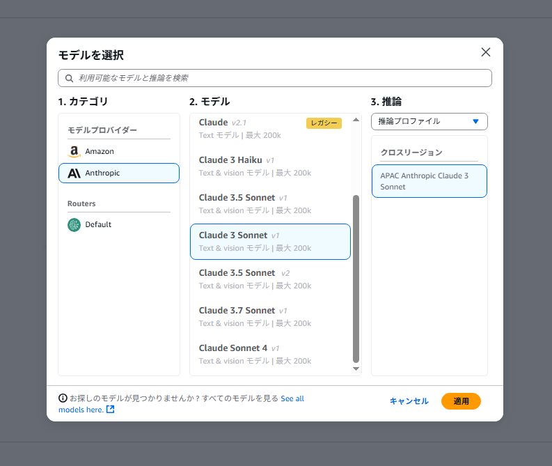 例:Claude、Titan、Nova など - 画面右下の「次へ」ボタンを押す
