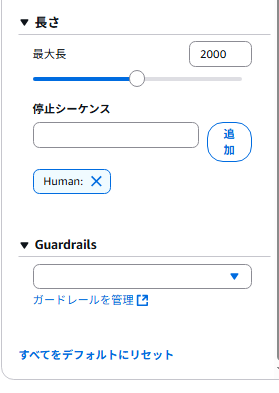 指定した文字列が出現したら生成を終了します(例:Human:など)。