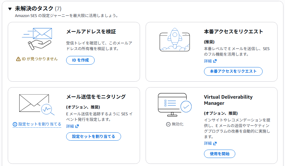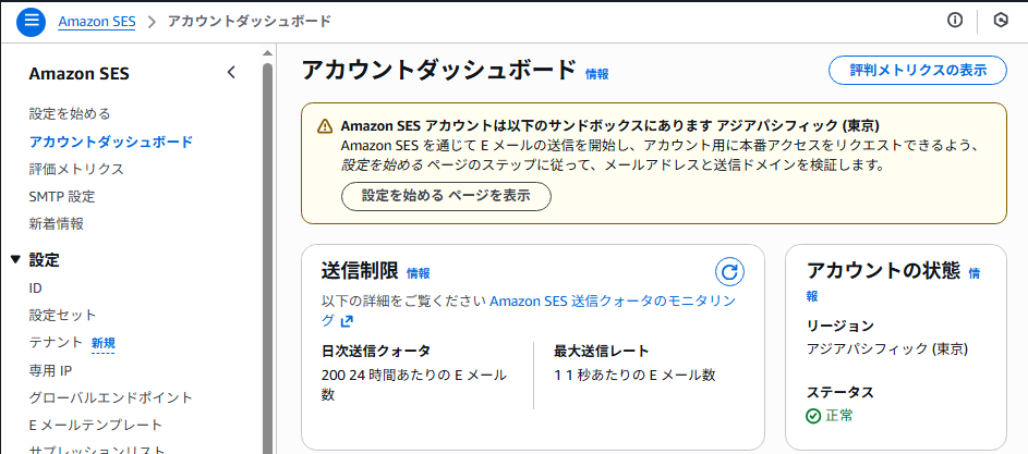 ここまでで、現在の SES アカウントが「サンドボックス」なのか、「本番」なのかを確認できる画面が開けます。