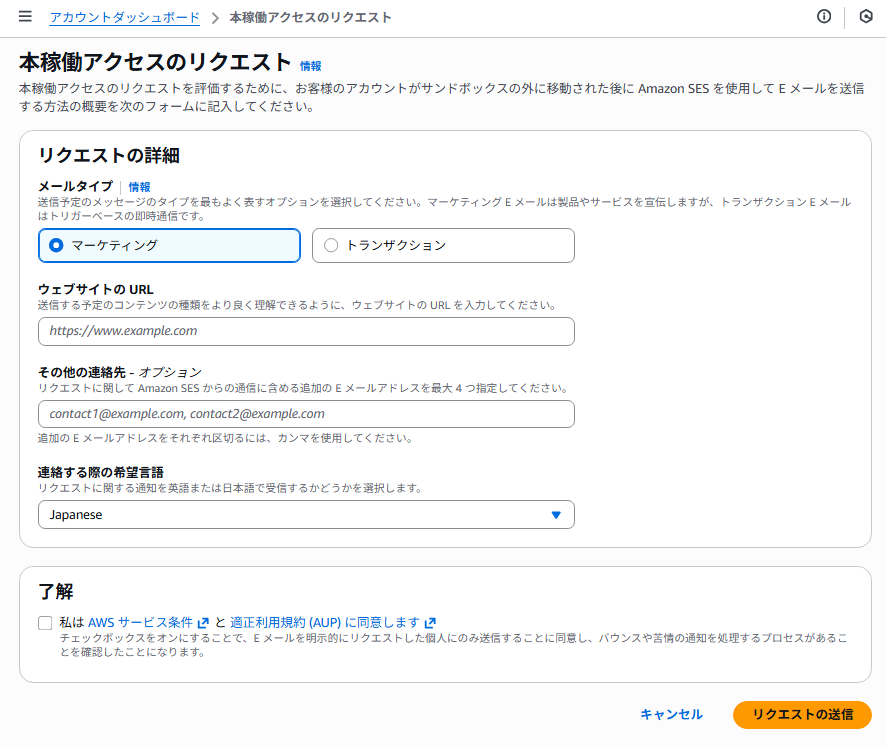 といった内容に同意するチェックボックスが表示されます。ここにチェックを入れないと申請は送信できません。AWS ドキュメント+1