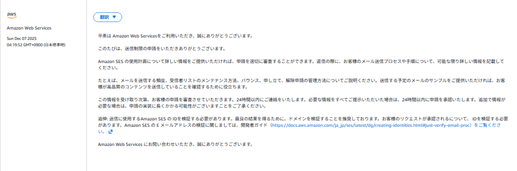 以上が、Amazon SES のサンドボックスを解除して本番アクセスを有効化するまでの大まかな流れです。