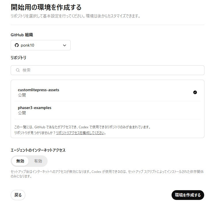 この画面では、Codexが操作対象とするリポジトリを選び、その上で実行用の「環境」をセットアップします。