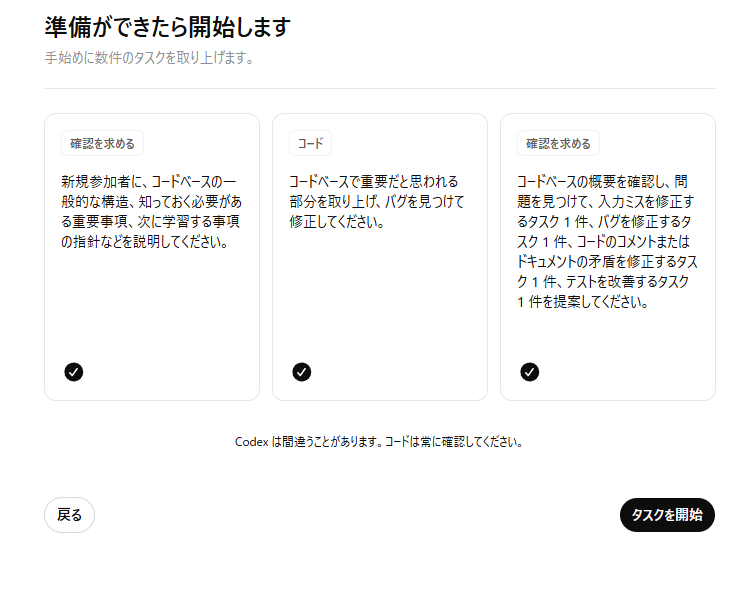 この画面では、Codexにやらせたい最初の仕事(タスク)を明示的に選択します。