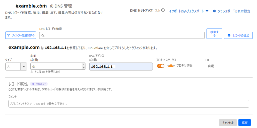 • プロキシ(オレンジ雲):ONにする(CloudflareのCDNとセキュリティ機能を適用)
