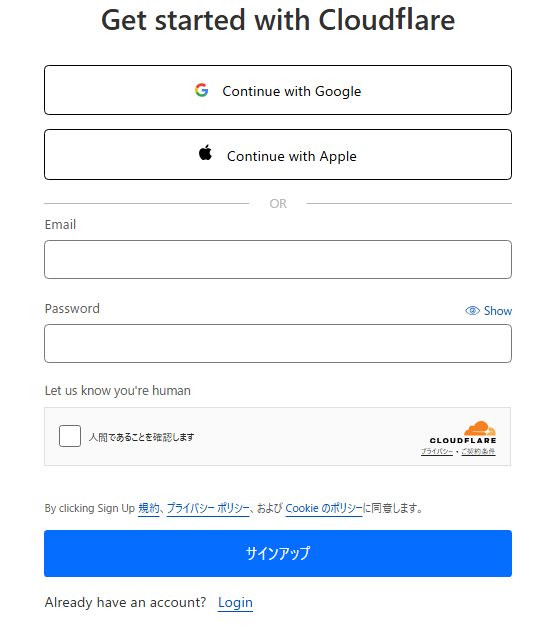 無料プラン(Free Plan)を選択後、Cloudflareのアカウントを作成するために表示されます。