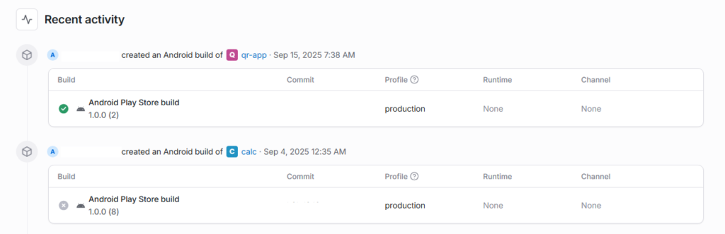 まず Projects で対象アプリを特定し、Project詳細(Slug/ID/Owner) を控えて参照情報を固定します。次に Recent activity/Builds を使って 最新の成功ビルド を特定し、表示される バージョン/ビルド番号/Commit/Profile を記録します。最後に Credentials を開き、Expo側(Android keystore)と Google Play Console(Upload key) の SHA-256 を照合して、同じ鍵で署名できているかを確認します(MD5は参考表示で判断不要です)。