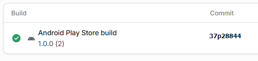 その行のビルド結果と種類。左のアイコンで成功/失敗、その下にビルド名(例:Android Play Store build)とバージョン/ビルド番号(例:1.0.0 (2))が表示。