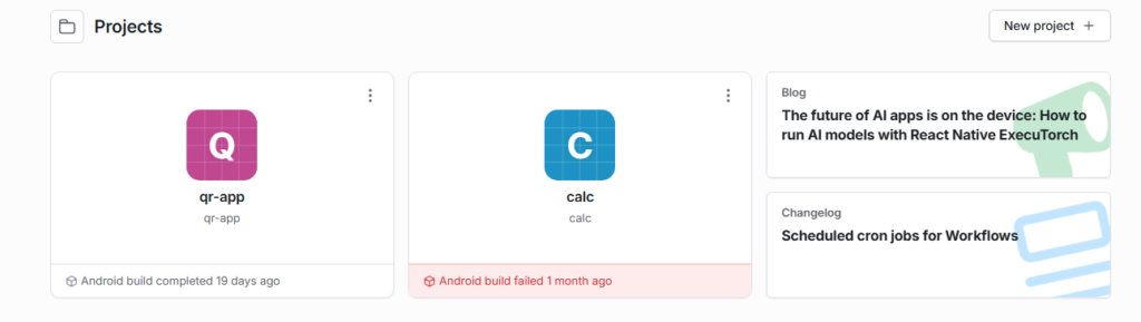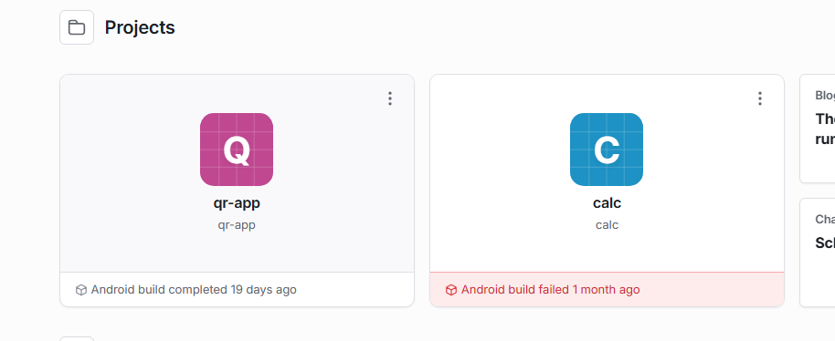 - サムネ・アプリ名のほか、直近のビルド結果(例:Android build completed 19 days ago / failed 1 month ago)が一行で分かります。