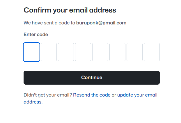 登録したメールアドレス宛に8桁の認証コードが送信されます。メールを確認し、コードを入力して「Continue」をクリックします。