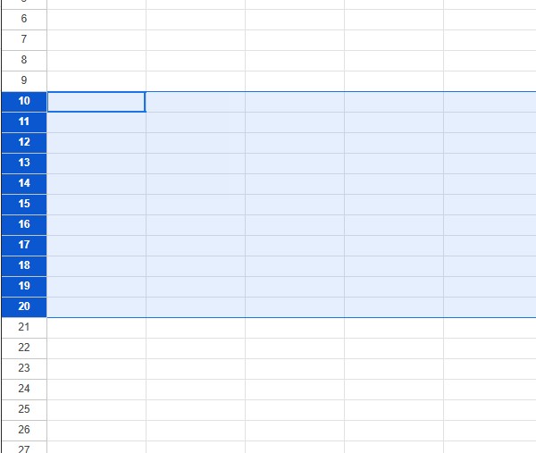 10行目から20行目の行を非表示にする場合、行番号「1」から「10」までをドラッグして選択します。