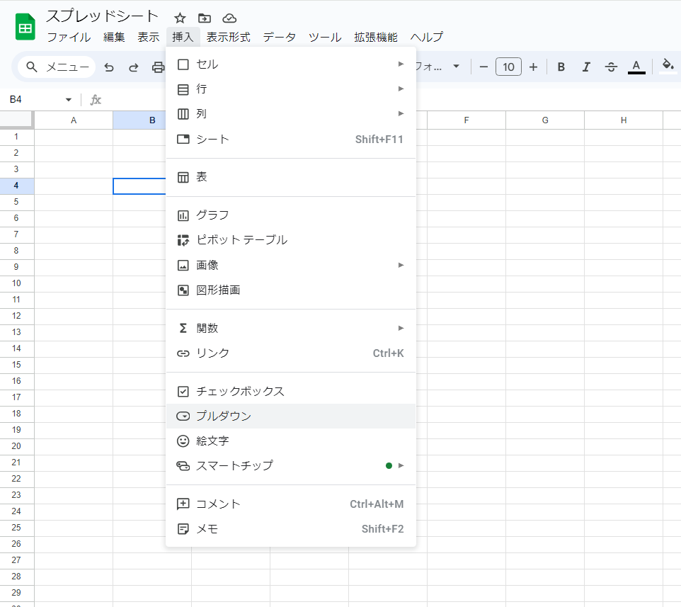 • メニューから「挿入」を選択し、「プルダウン」をクリックします。