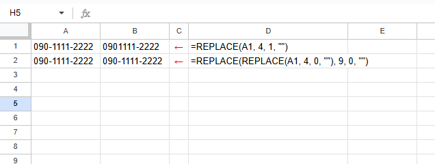 =REPLACE(元の文字列, 開始位置, 文字数, 新しい文字列)
