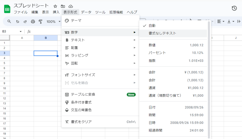 2. メニューバーから「書式」→「数字」→「書式なしテキスト」を選択します。
