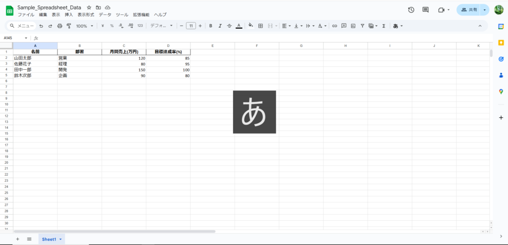 エクセル経験者であればスムーズに使える部分ですが、セルをクリックして文字や数値、数式を入力する操作はほぼ同様です。代表的な関数としては、SUMやAVERAGE、IF、VLOOKUPなど、エクセルで使うものと共通のものが多くあります。またGoogle独自のQUERY関数など、スプレッドシートならではの便利な関数もあります。
