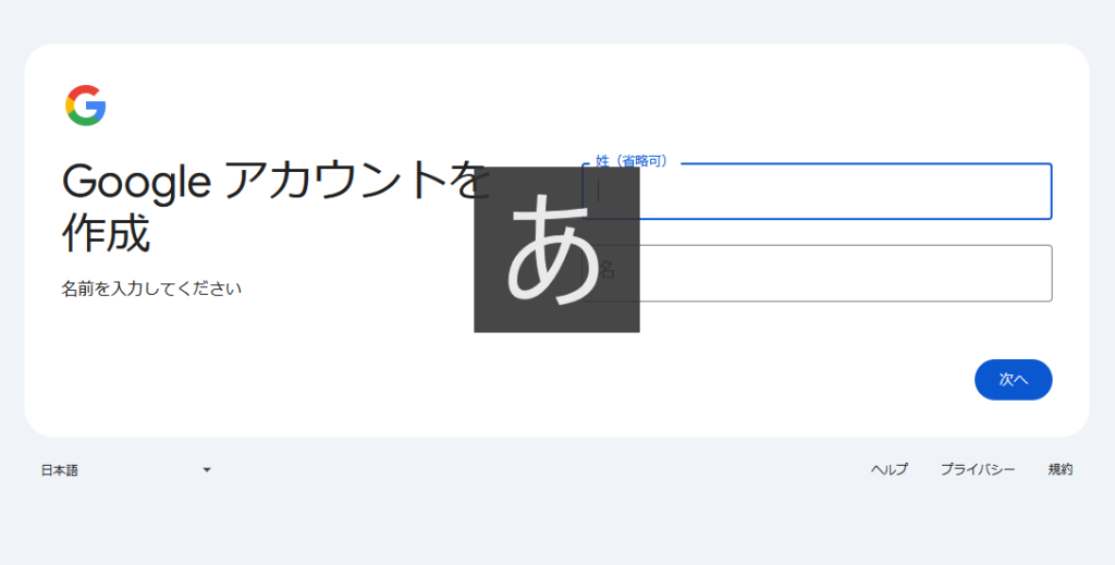- Googleアカウント作成ページにアクセス