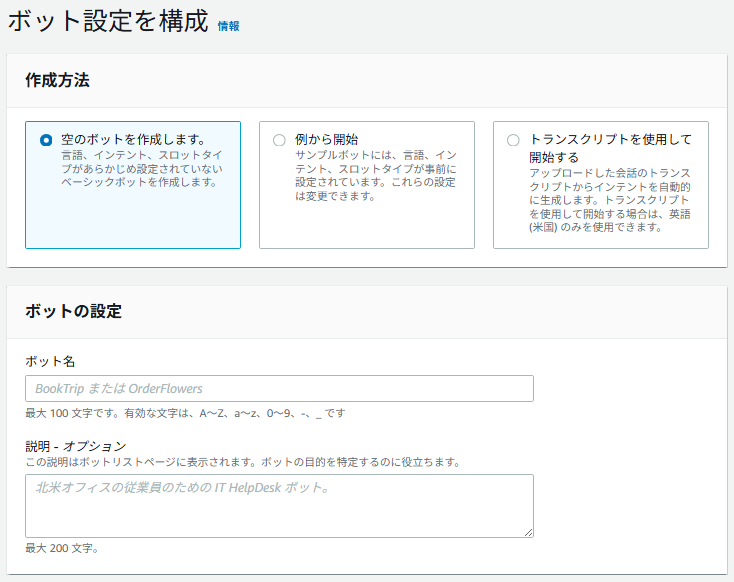 - ランタイムロール:「基本的な Amazon Lex 権限を持つロールを作成します」を選択