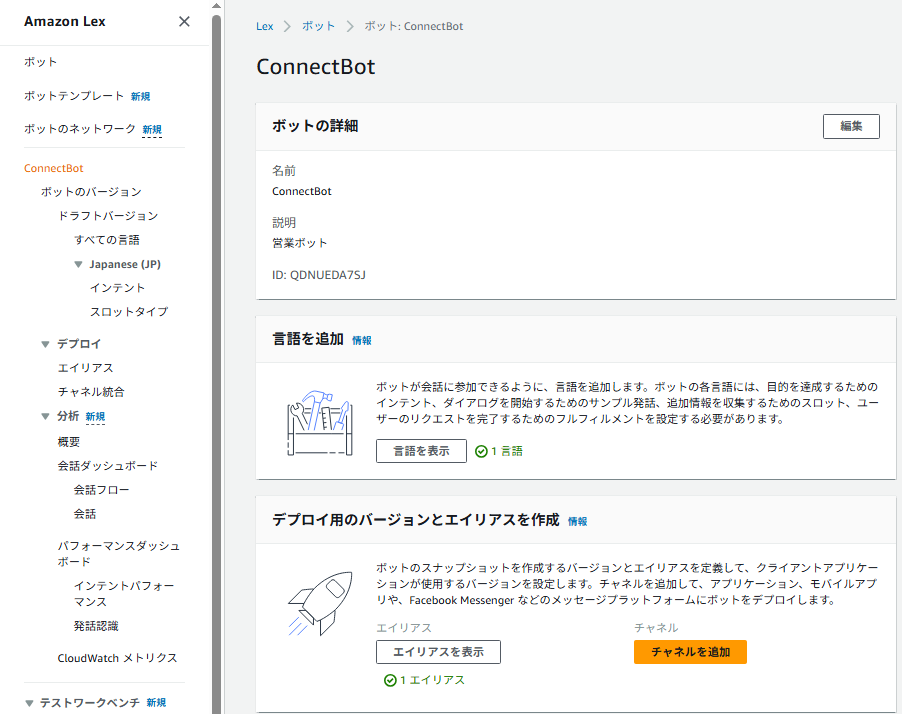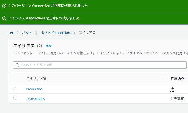 なお、動作確認用として「TestBotAlias」というエイリアスも併せて作成しており、こちらでは本番反映前のテスト用会話シナリオの検証が可能です。