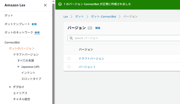 ※ドラフト状態では本番運用に使えないため、まず「バージョン1」などを作成する必要があります。