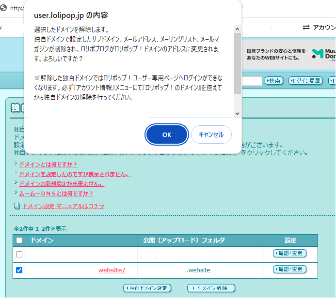 ロリポップで取得・設定した独自ドメインをサーバー上から完全に削除する操作です。これを行うと以下が発生します。