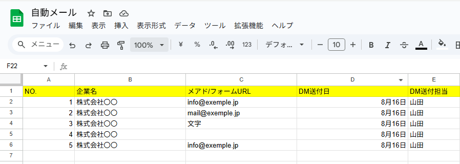 このようなファイル例では C列(3列目) にメールアドレスを入力する想定でスクリプトを組みます。