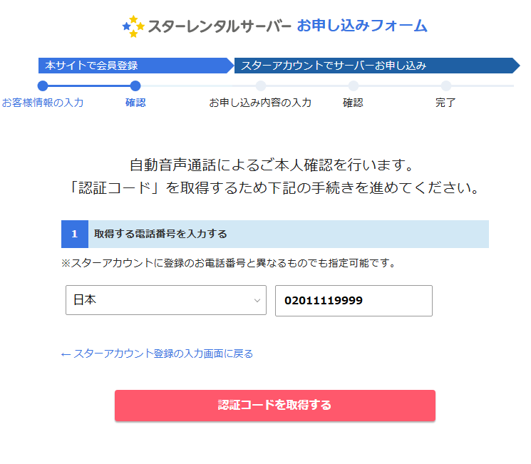 メールアドレスの確認、そして登録内容の確認が終わった後、電話認証の確認があります。