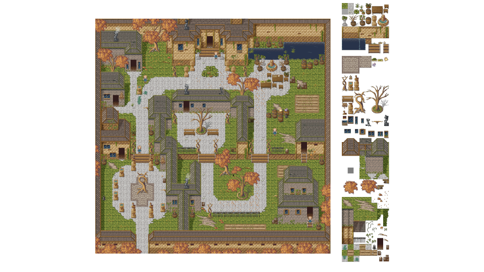 下記、左側の画像は一般的に「タイルマップ」と呼ばれます。これは、ゲーム内で使用される背景や地形、建物などを配置した完成マップのことです。
