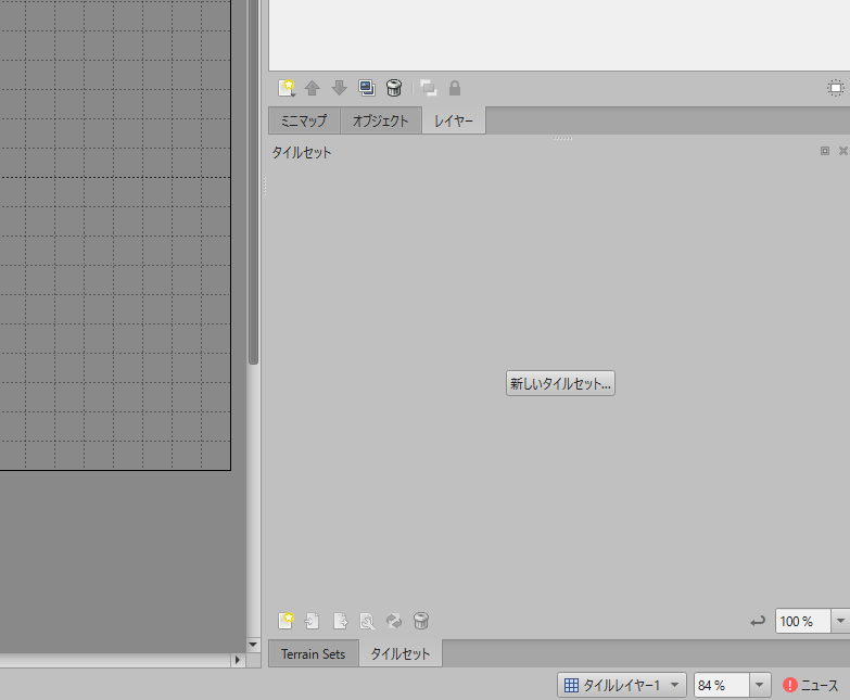 新しいマップの設定が完了しOKを選択したらマップが作成されます。右側にある、新しいタイルセットから、画像ファイルを開きます。イラストレーター等、ご自身で作成したものでも良いです。またはサイトからダウンロードして使用することもお勧めします。