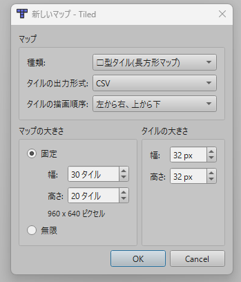 この画面はTiledの「新しいマップ」を作成する際の設定ウィンドウです。マップの種類(形状)、出力形式、タイルの描画順序、マップのサイズ(タイル数)、およびタイルのサイズ(幅と高さ)を指定して新規マップを作成できます。