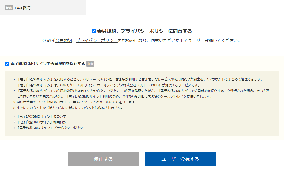• 会員規約とプライバシーポリシーに同意し、チェックを入れる。