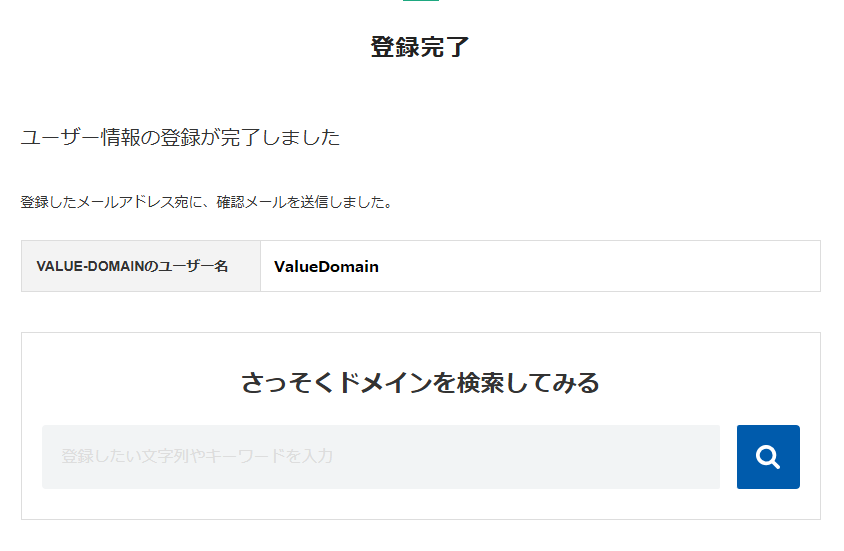 • アカウント登録が完了し、「VALUE-DOMAINのユーザー名」が表示される。