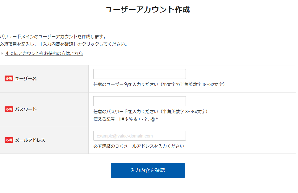 バリュードメインの公式サイトにアクセスし、「新規アカウント作成」のページを開きます。