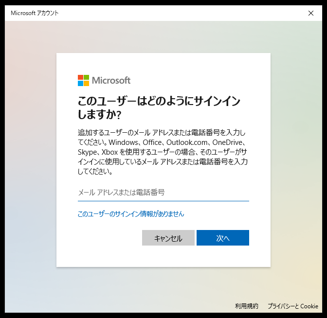 2. 次の画面で「Microsoftアカウントを持たないユーザーを追加する」をクリック