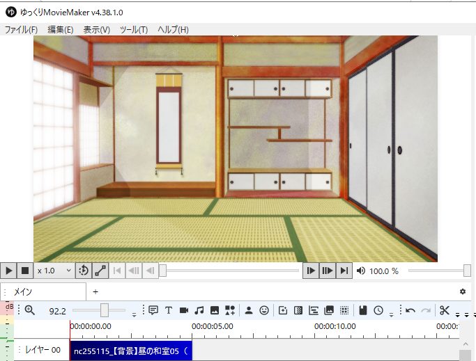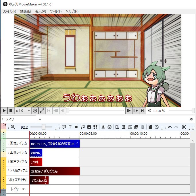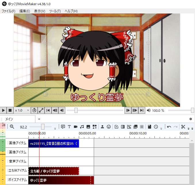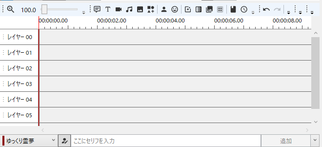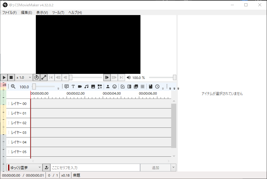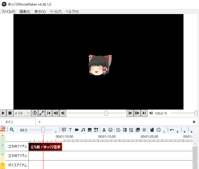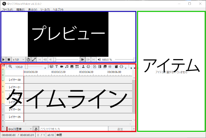 ゆっくりMovieMakerのメインウィンドウは、以下の要素で構成されています。